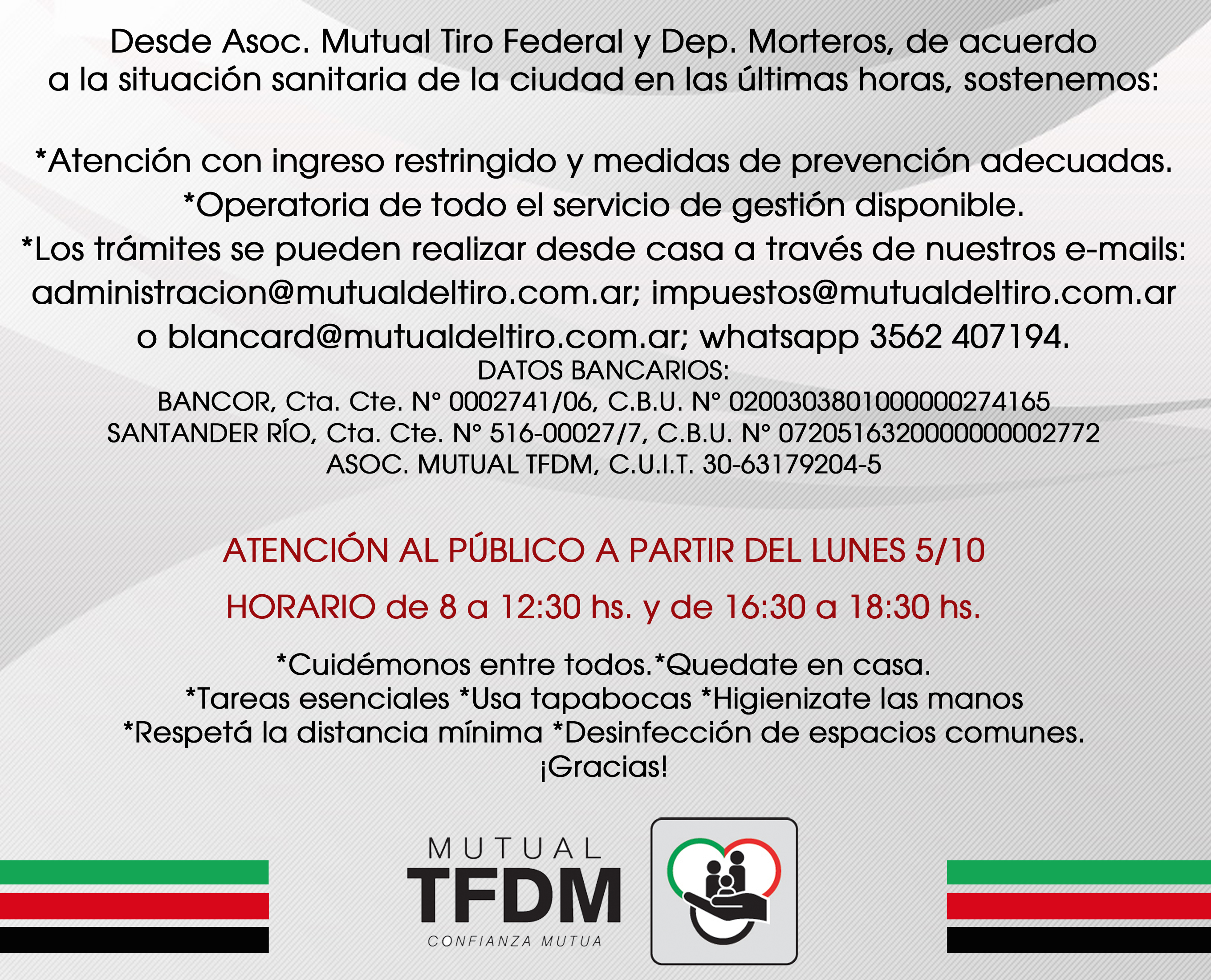 IMPORTANTE…Nos seguimos cuidando y te seguimos cuidando, la responsabilidad social depende de la responsabilidad individual por eso les pedimos que asistan a la Mutual por gestiones esenciales y que estamos a disposición para que puedan resolver situaciones desde sus hogares. Nos cuidamos entre todos, hoy más que nunca.